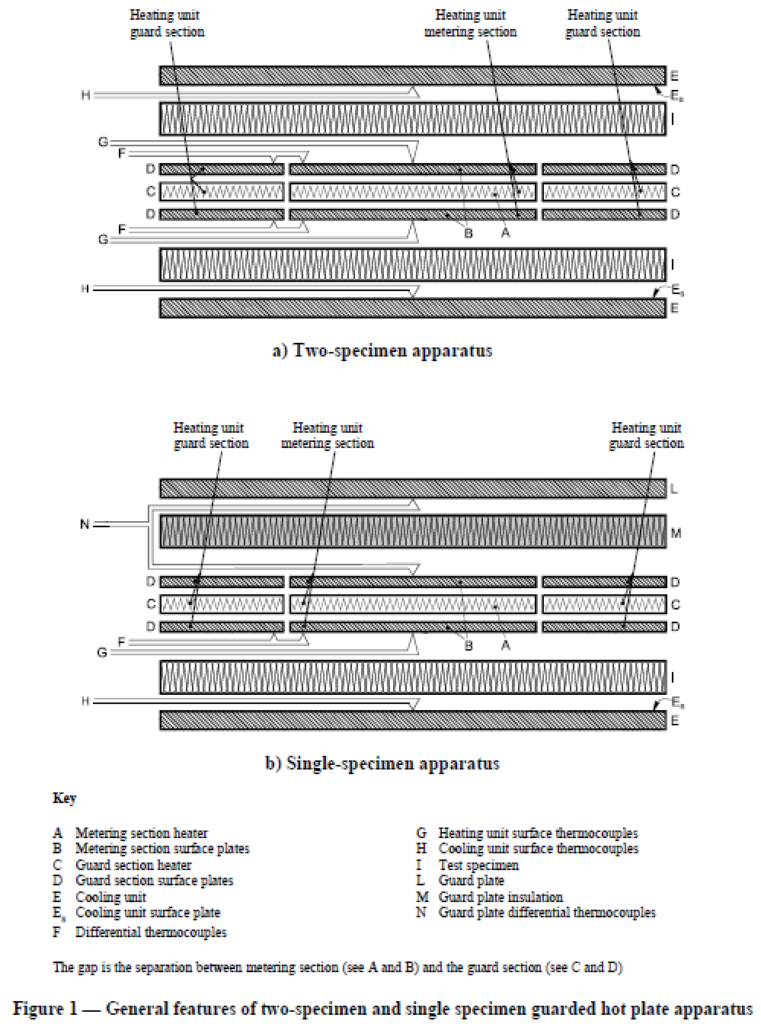 Both the guarded hot plate apparatus and the heat flow meter apparatus are intended to establish within homogeneous specimens with flat parallel faces, in the form of slabs, a unidirectional constant and uniform density of heat flow rate. The part of the apparatus where this takes place with acceptable accuracy is around its centre; the apparatus is therefore divided into a central metering section in which measurements are taken, and a surrounding guard section.