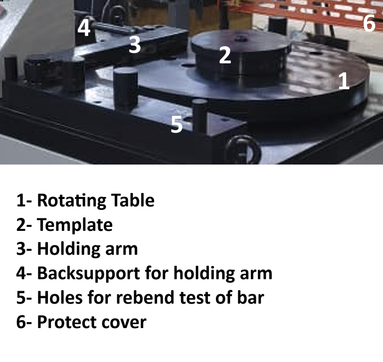 - On the rotating table, there are holes for putting the loading pin on it. the proper hole will be selected based on the size of the bar. Also in the middle of the rotating table, there is template for bending the bar around that template. Choose proper template based on the size of the bar.