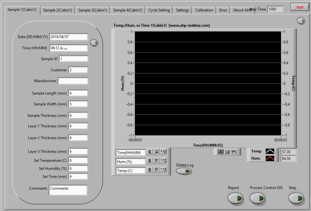 After installation of the driver, you need to install the software itself. The software comes to you on a flash disk. Install the software with no change in the root of installation. On the front panel of the software, you have 4 sample settings pages. It allows you to set up four different groups of samples that you place inside the test chamber. As depicted in the picture below, you can input general sample settings on left side of this page. Then, to start recording the data of temperature and humidity, click on “Process Control ON”. Any time you want to stop recording, you can click on “Stop”.