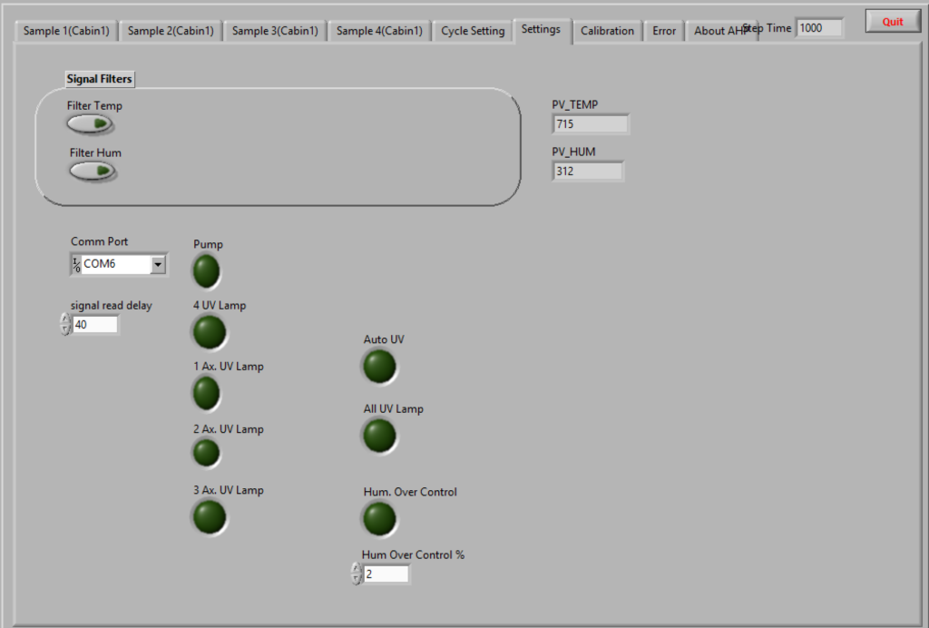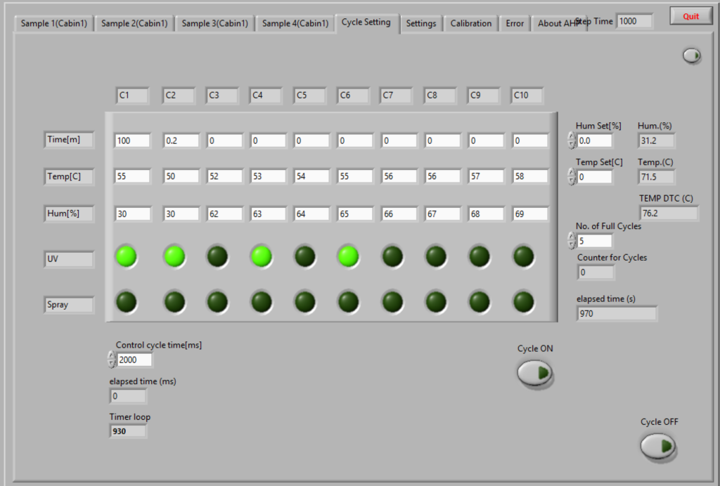 On this page, you can set the cycle of the test. Time, Temperature, Humidity, and UV lamps can be set on this page. Spray function is an option, and you need to order it in case of need. Also, you can set the total number of cycles for testing.