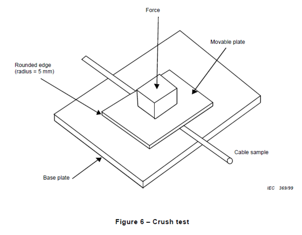 The apparatus shall allow a sample of cable to be crushed between a flat steel base plate and a movable steel plate which applies the crushing force uniformly over a 100 mm length of the sample.