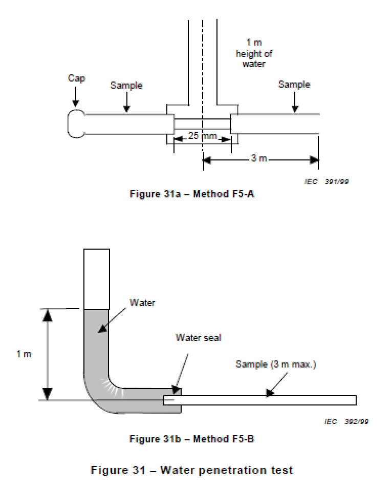 Compliance shall be checked on samples of cable using one of the two following methods (F5A or F5B), as stated in the detail specification. Method F5A tests for water migration between the outer interstices of the optical core and the outer sheath, whereas method F5B tests for water migration over the entire cross-section designed to be water-blocked.