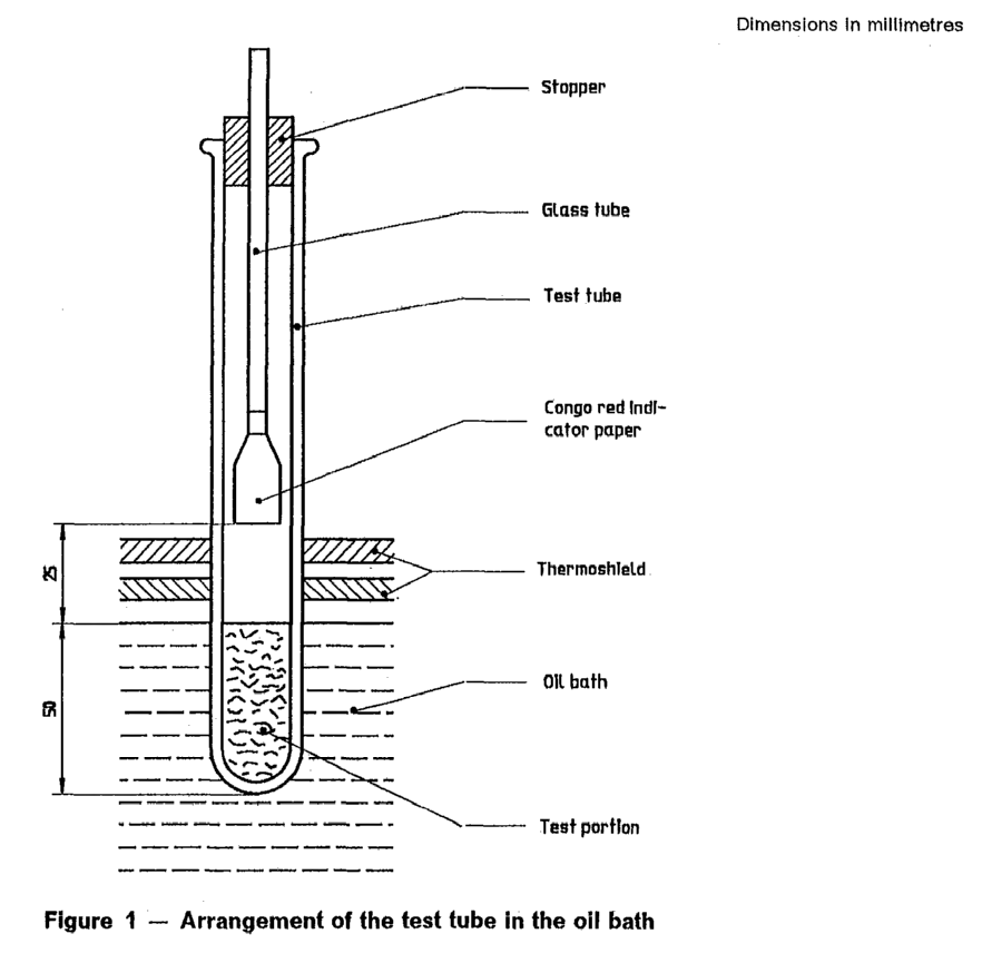 A test portion of the PVC compound or product is maintained at an agreed temperature in still air until the color of a Congo red paper held above it changes from red to blue. If universal indicator paper is used, the relevant color change is that corresponding to pH 3. The time required for the color change is taken to be the stability time, ts.